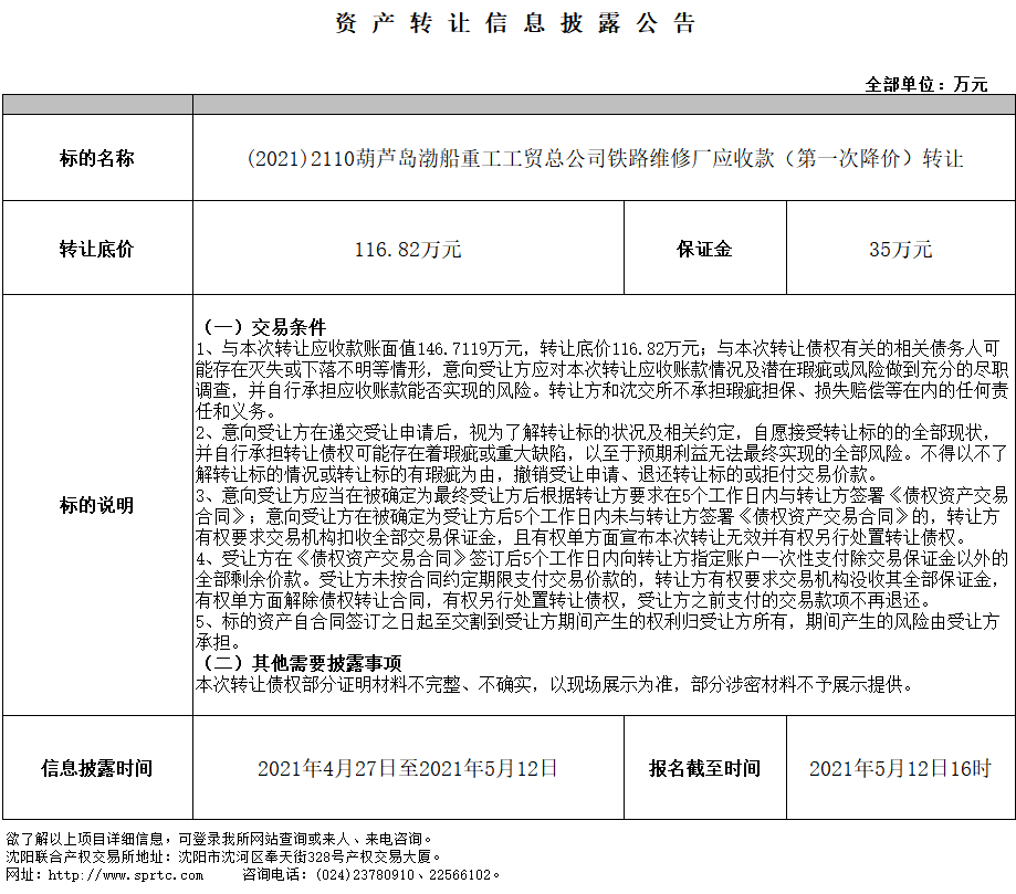 葫蘆島渤船工貿(mào)鐵路維修廠(chǎng)應(yīng)收款(第一次降價(jià))轉(zhuǎn)讓