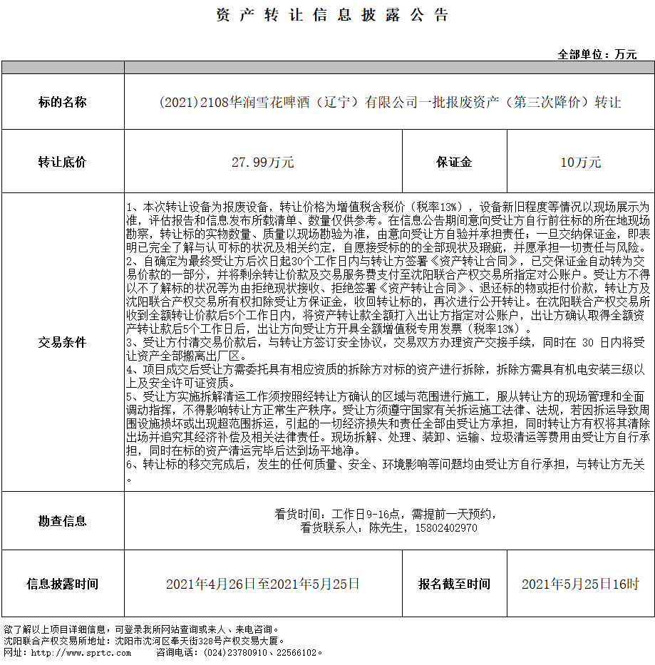華潤雪花啤酒(遼寧)有限公司一批報廢資產(第三次降價)轉讓