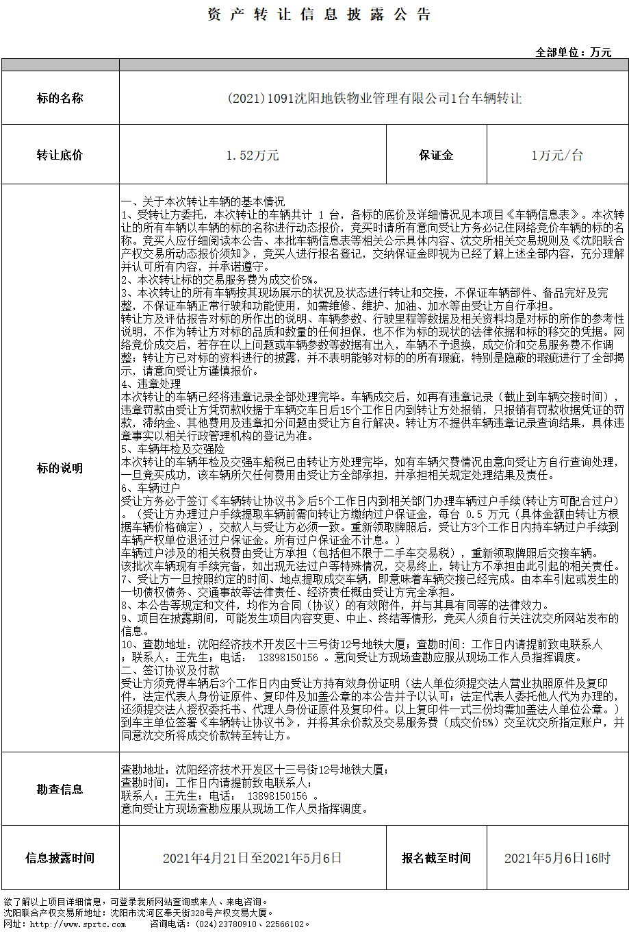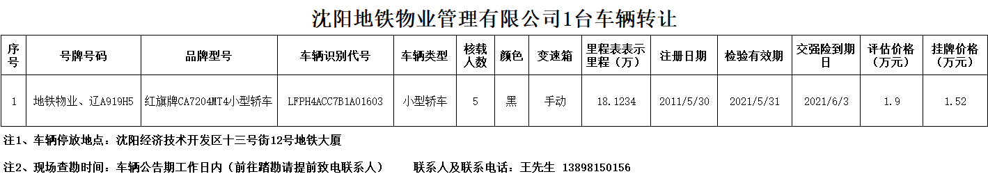沈陽(yáng)地鐵物業(yè)管理有限公司1臺(tái)車輛轉(zhuǎn)讓