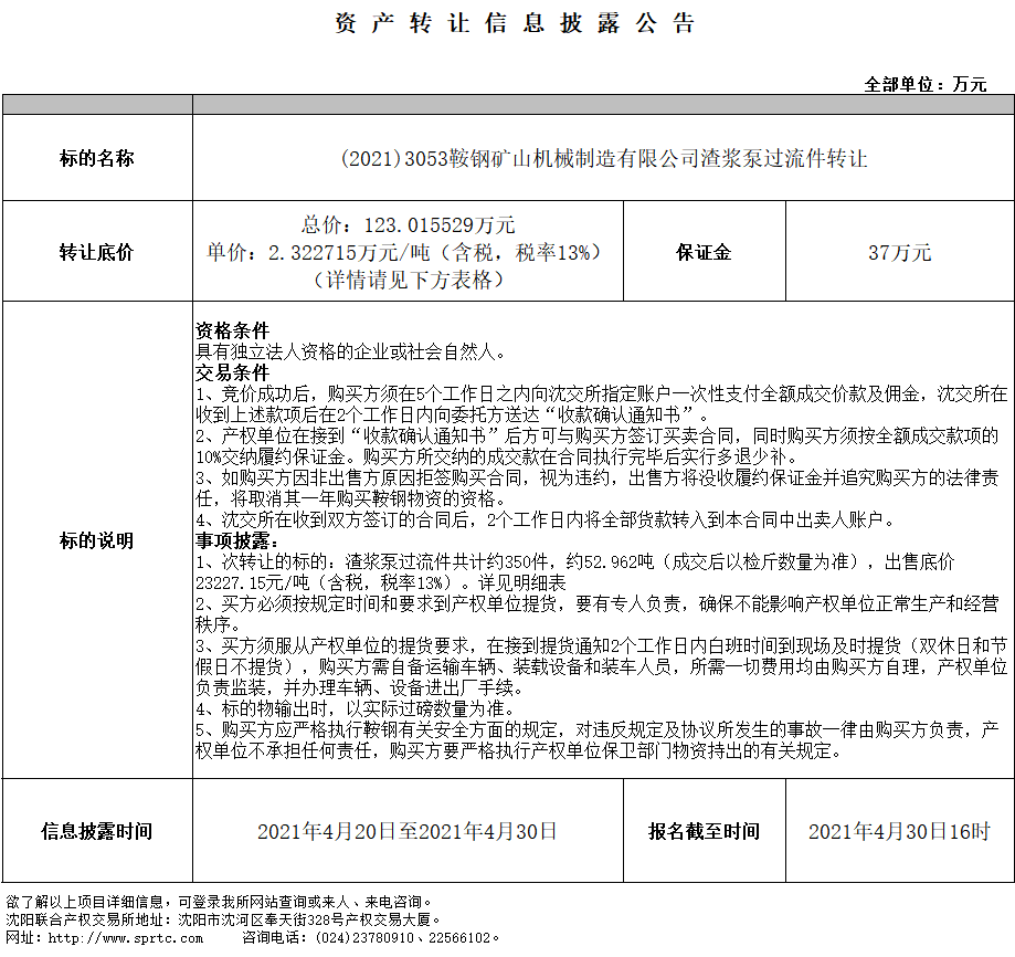 鞍鋼礦山機械制造有限公司渣漿泵過流件轉(zhuǎn)讓