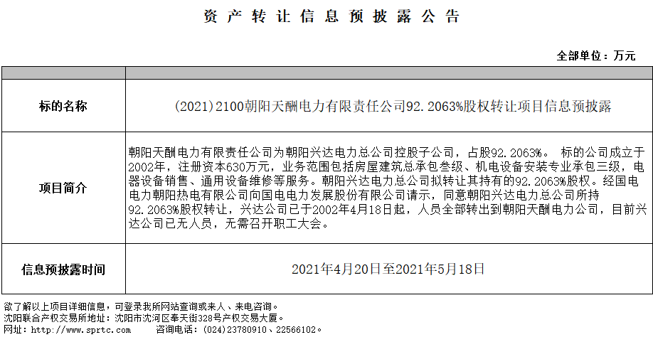 朝陽天酬電力有限責(zé)任公司92.2063%股權(quán)轉(zhuǎn)讓 信息預(yù)披露