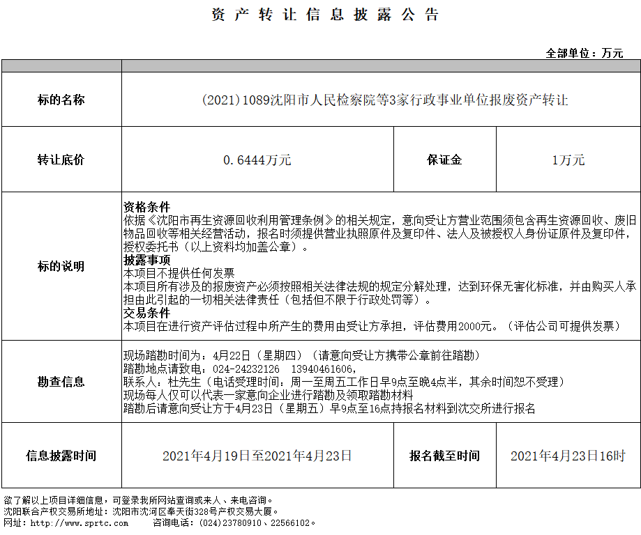 沈陽(yáng)市人民檢察院等3家行政事業(yè)單位報(bào)廢資產(chǎn)轉(zhuǎn)讓