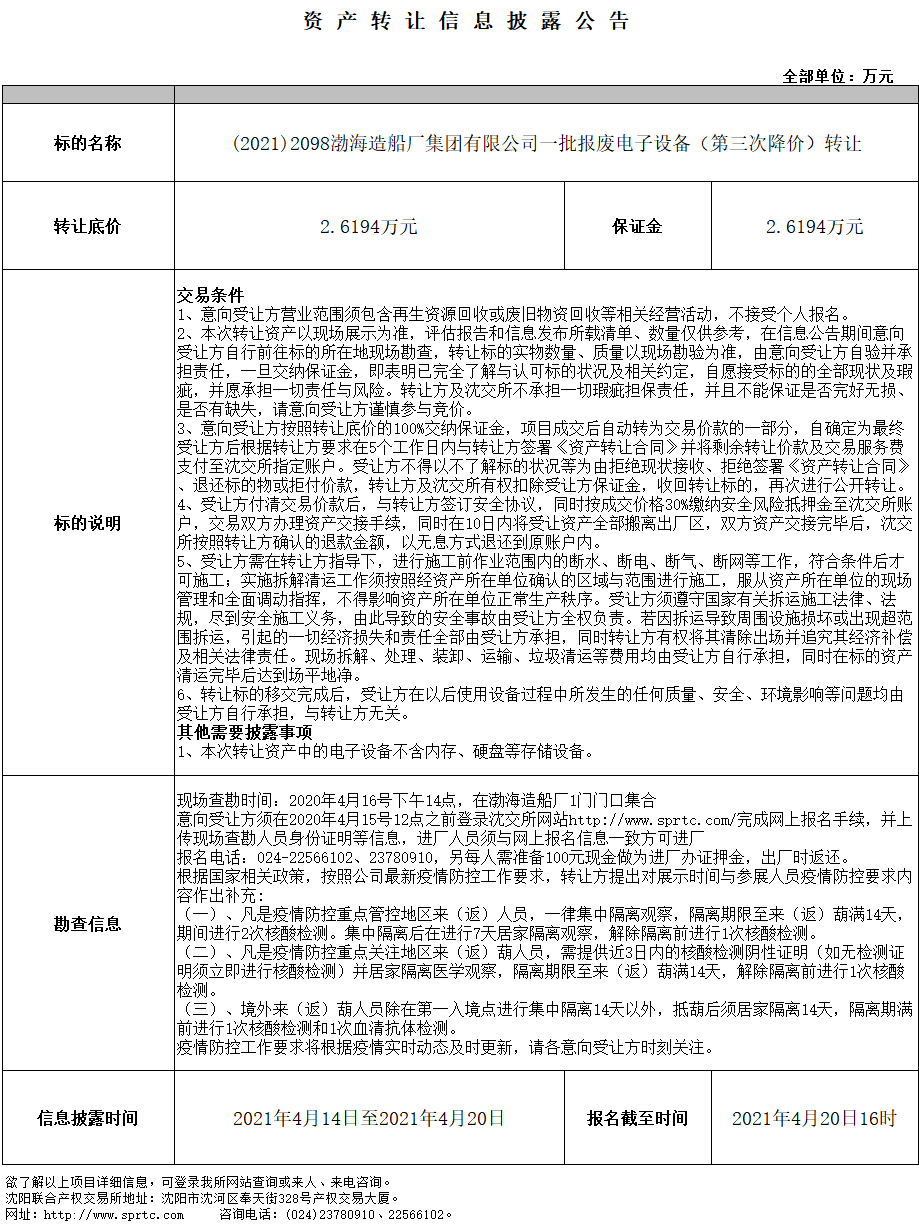 渤海造船廠集團有限公司一批報廢電子設(shè)備(第三次降價)轉(zhuǎn)讓