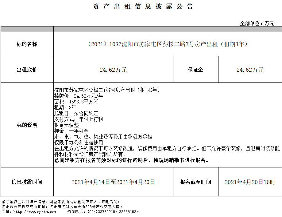 沈陽市蘇家屯區(qū)葵松二路7號房產(chǎn)出租(租期3年)