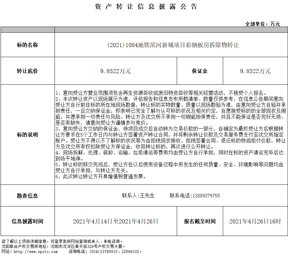 (2021)1084地鐵濱河新城項目彩鋼板房拆除物轉讓