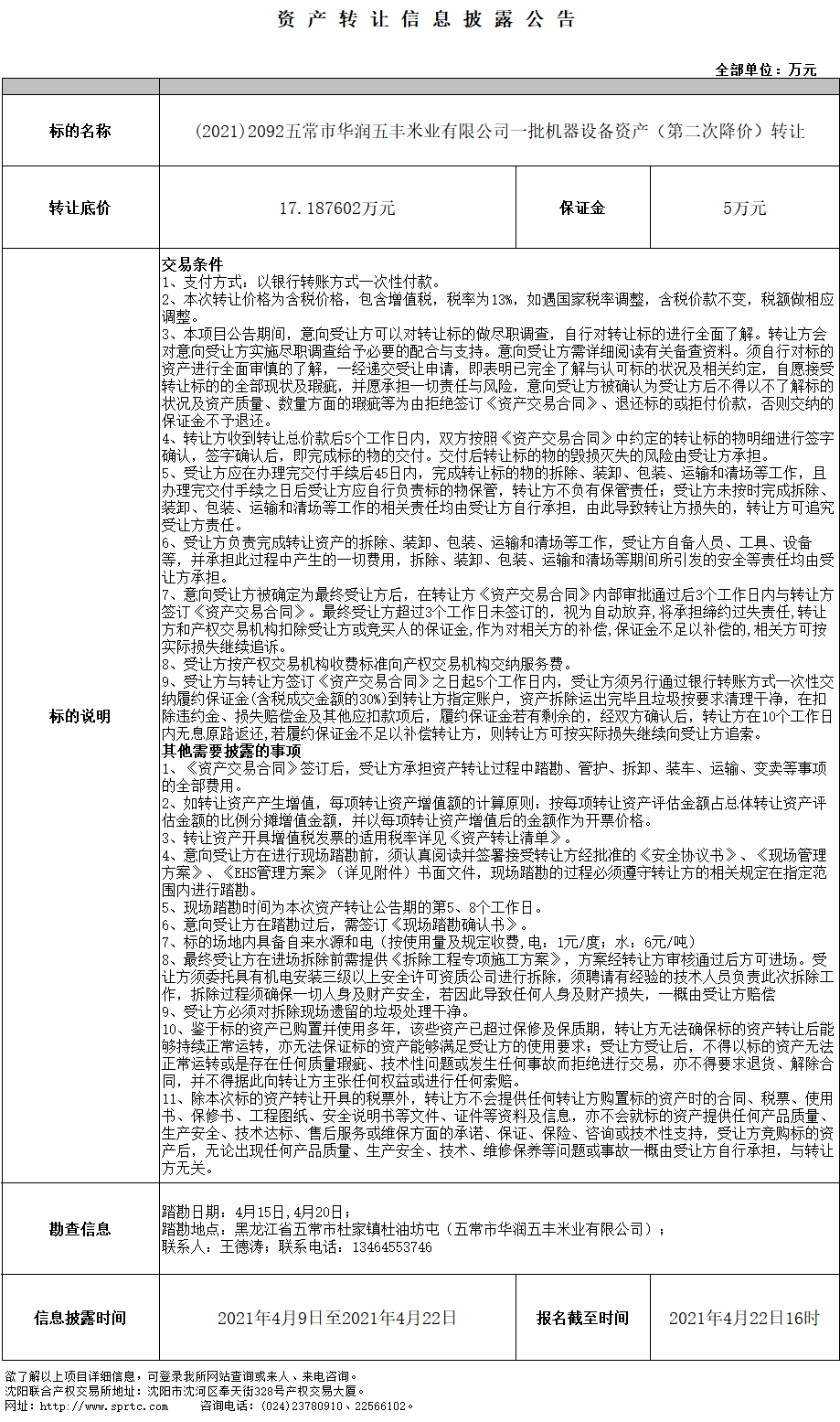 五常市華潤五豐米業(yè)有限公司一批機(jī)器設(shè)備資產(chǎn)(第二次降價(jià))轉(zhuǎn)讓