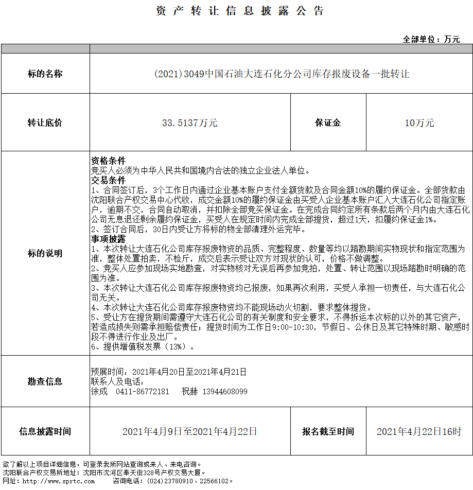 中國石油大連石化分公司庫存報廢設備轉(zhuǎn)讓