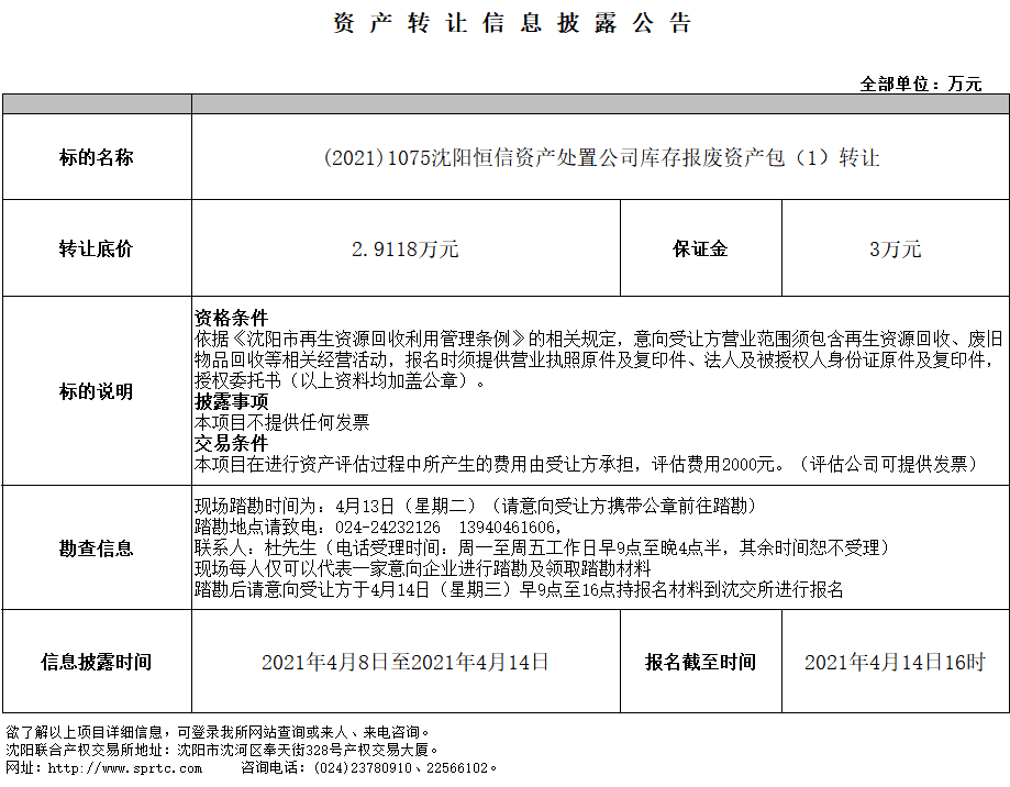 沈陽(yáng)恒信資產(chǎn)處置有限公司庫(kù)存報(bào)廢資產(chǎn)包(1)