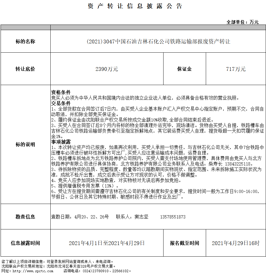 中國石油吉林石化公司鐵路運(yùn)輸部報(bào)廢資產(chǎn)轉(zhuǎn)讓