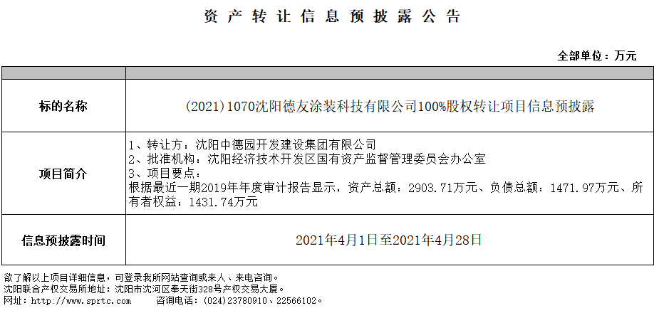 沈陽(yáng)德友涂裝科技有限公司100%股權(quán)轉(zhuǎn)讓信息預(yù)披露