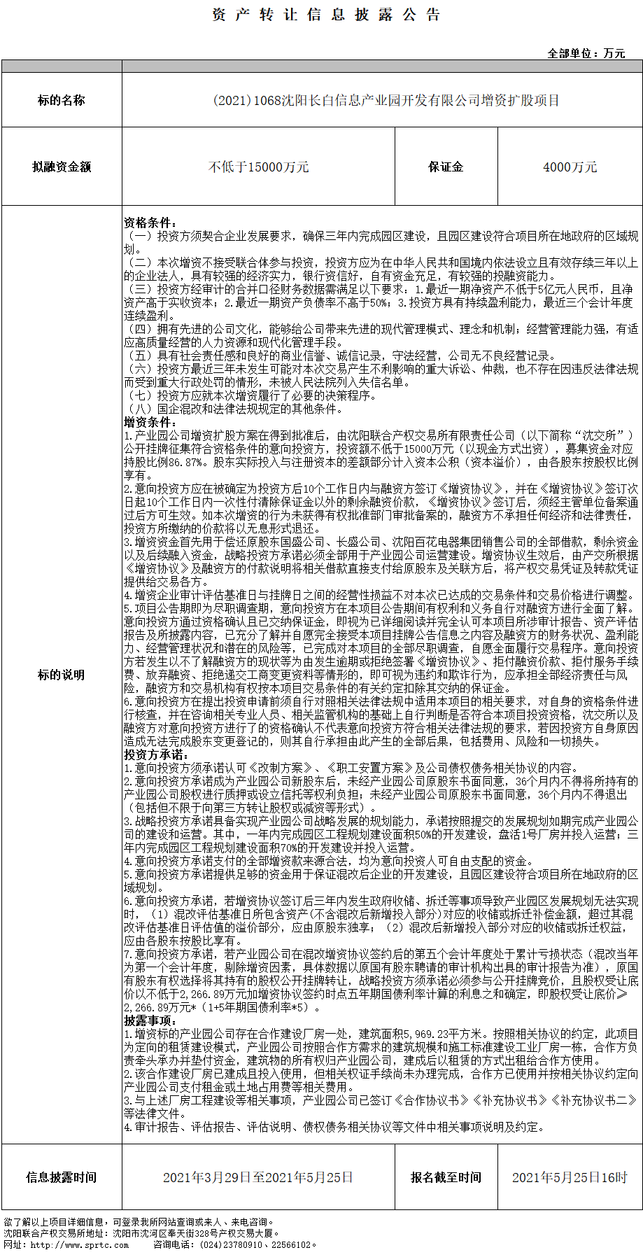 沈陽長白信息產(chǎn)業(yè)園開發(fā)有限公司增資擴(kuò)股項(xiàng)目
