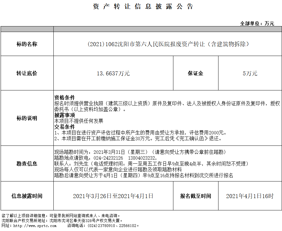 沈陽(yáng)市第六人民醫(yī)院報(bào)廢資產(chǎn)轉(zhuǎn)讓(含建筑物拆除)項(xiàng)目