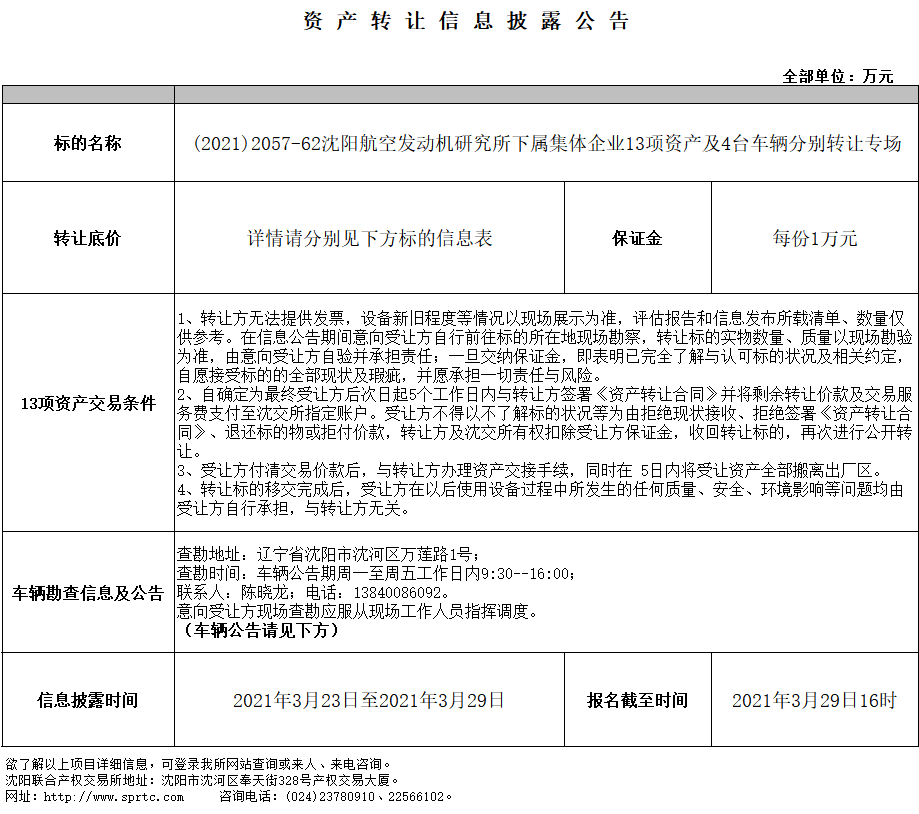 10、查勘地址: 遼寧省沈陽(yáng)市沈河區(qū)萬(wàn)蓮路1號(hào);查勘時(shí)間: 車輛公告期周一至周五工作日內(nèi)9:30--16:00;聯(lián)系人: 陳曉龍 ;電話: 13840086092 。意向受讓方現(xiàn)場(chǎng)查勘應(yīng)服從現(xiàn)場(chǎng)工作人員指揮調(diào)度。