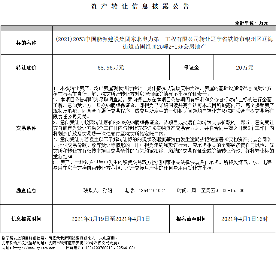 中國(guó)能源建設(shè)集團(tuán)東北電力第一工程有限公司轉(zhuǎn)讓 遼寧省鐵嶺市銀州區(qū)遼海街道苗圃組團(tuán)25幢2-1辦公房地產(chǎn)