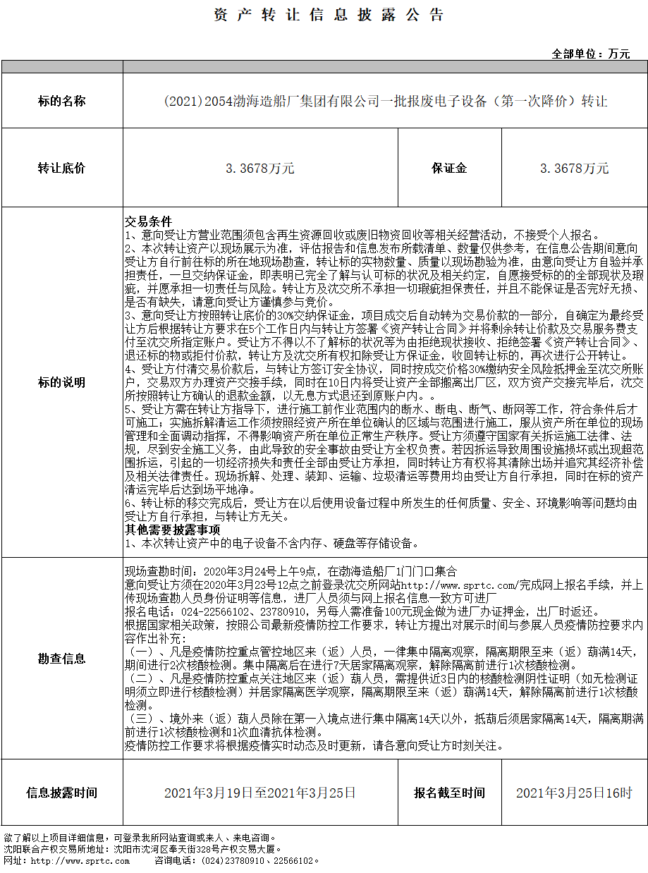 渤海造船廠集團(tuán)有限公司一批報(bào)廢電子設(shè)備(第一次降價(jià))轉(zhuǎn)讓