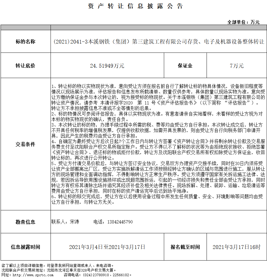 本溪鋼鐵(集團(tuán))第三建筑工程有限公司存貨、電子及機(jī)器設(shè)備整體轉(zhuǎn)讓