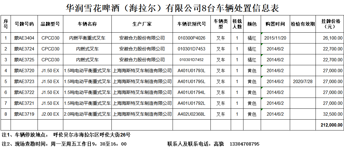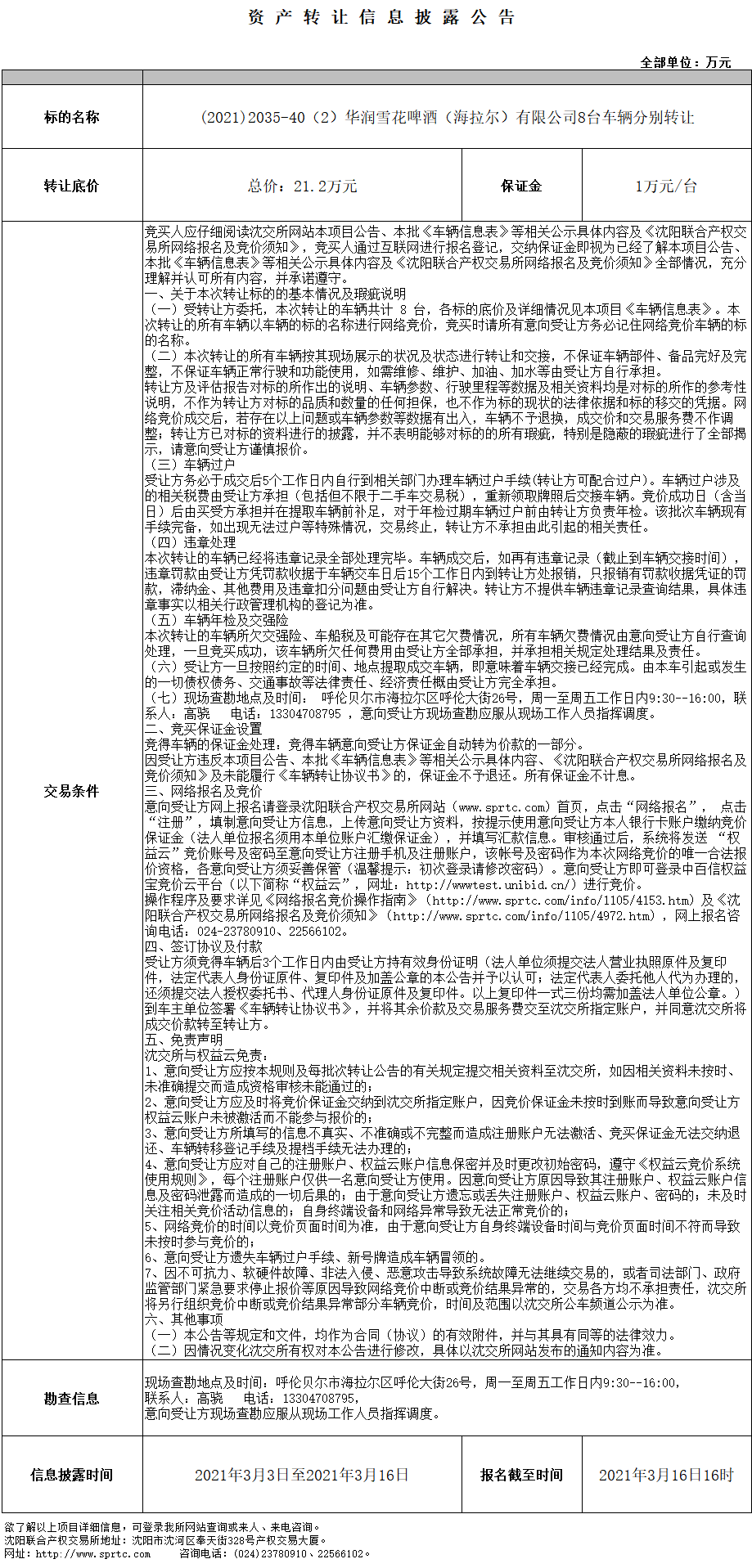 (2021)2040華潤雪花啤酒(海拉爾)有限公司8臺車輛分別轉(zhuǎn)讓