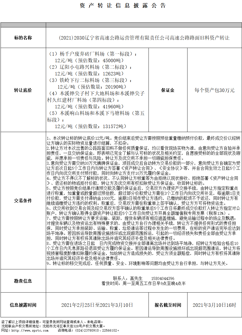 高速公路路面舊料資產(chǎn)轉(zhuǎn)讓(第二標(biāo)段遼陽小屯路興料場)