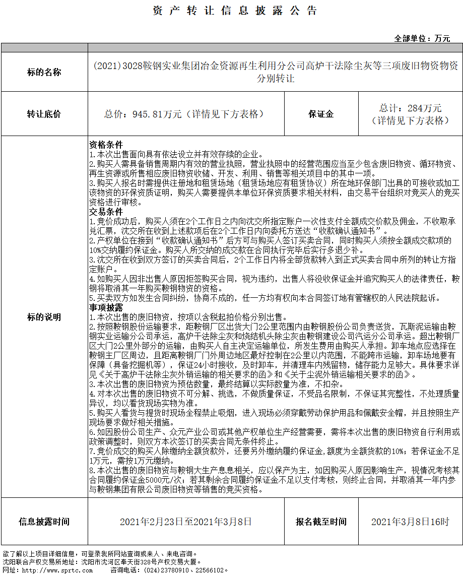 鞍鋼實業(yè)集團冶金資源再生利用分公司高爐干法除塵灰轉(zhuǎn)讓