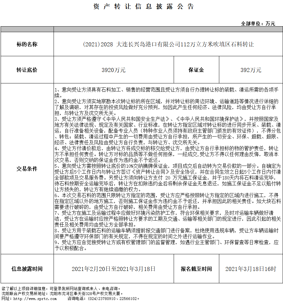 大連長興島港口有限公司112萬立方米吹填區(qū)石料轉(zhuǎn)讓