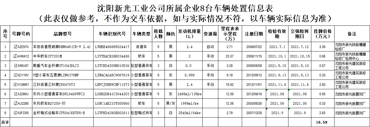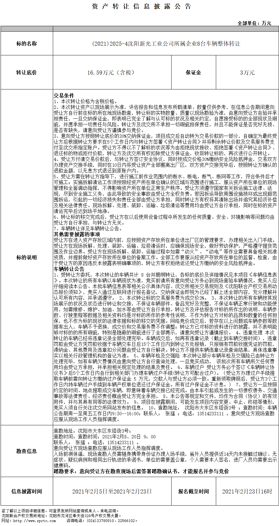 沈陽新光工業(yè)公司所屬企業(yè)8臺(tái)車輛整體轉(zhuǎn)讓