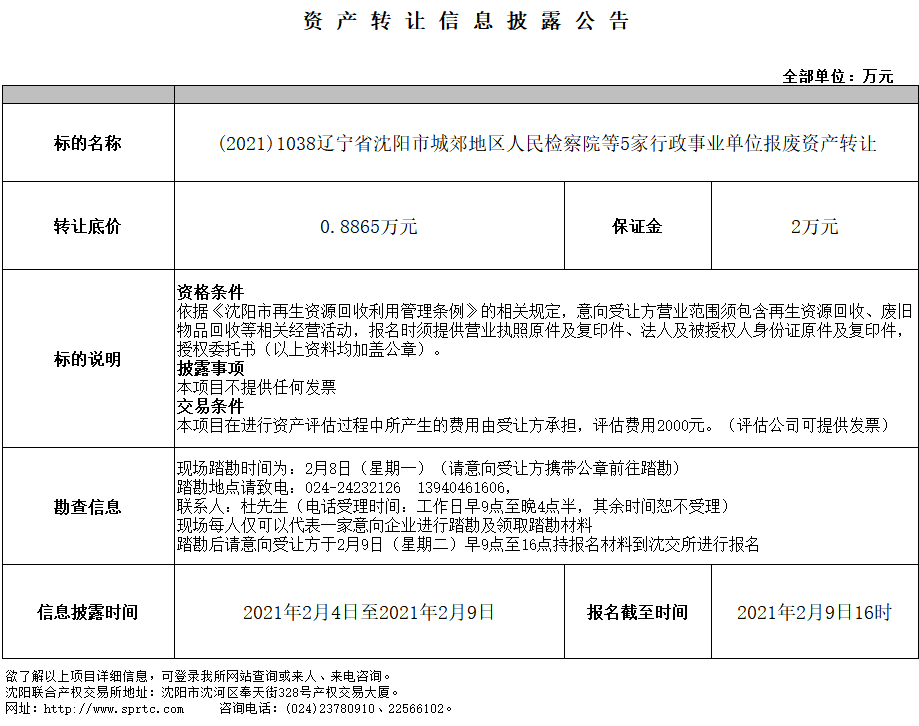 遼寧省沈陽市城郊地區(qū)人民檢察院等5家行政事業(yè)單位 報廢資產(chǎn)轉(zhuǎn)讓