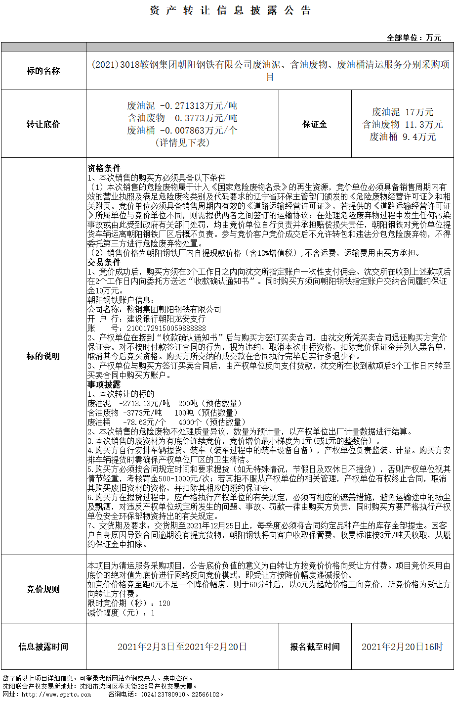 (2021)3018鞍鋼集團(tuán)朝陽(yáng)鋼鐵有限公司廢油泥、含油廢物、廢油桶清運(yùn)服務(wù)分別采購(gòu)項(xiàng)目