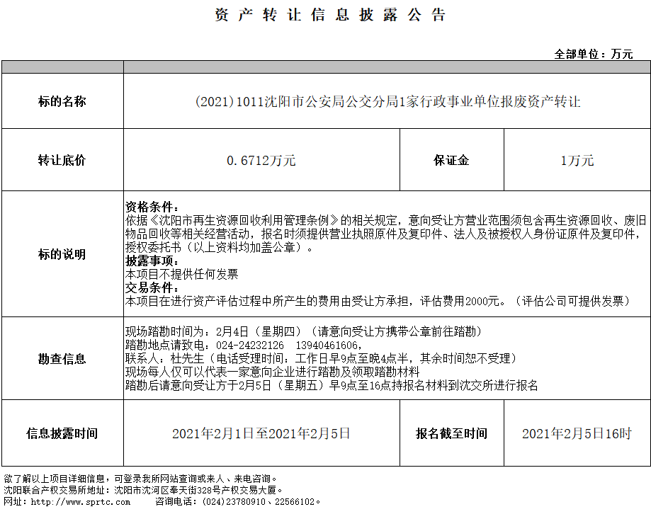 沈陽市公安局公交分局1家行政事業(yè)單位報廢資產轉讓