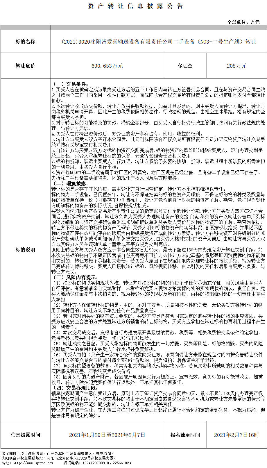 沈陽皆愛喜輸送設備有限責任公司二手設備轉讓(NO3二號生產(chǎn)線第五次)