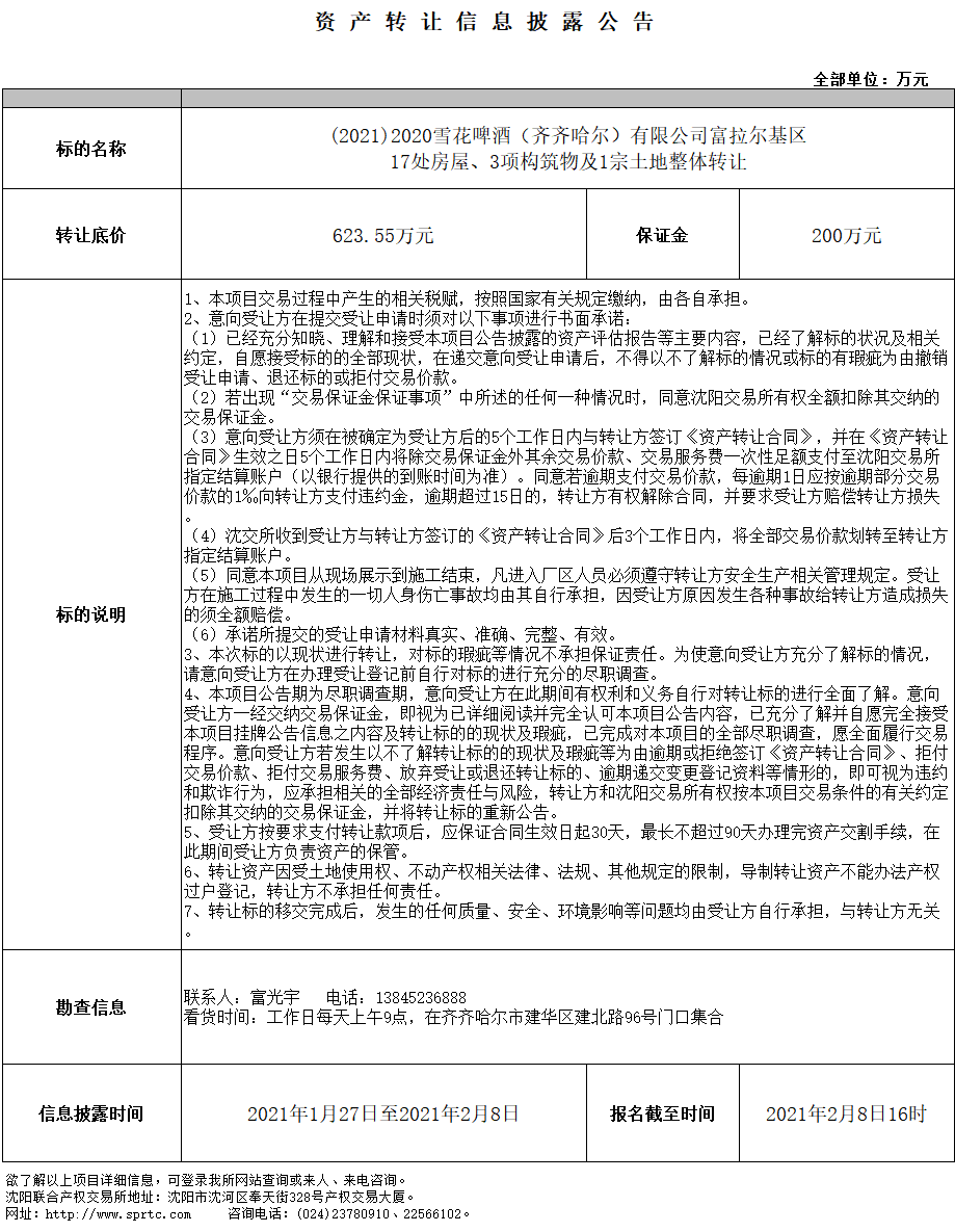 雪花啤酒(齊齊哈爾)有限公司富拉爾基區(qū)17處房屋、3項構筑物及1宗土地 整體轉讓