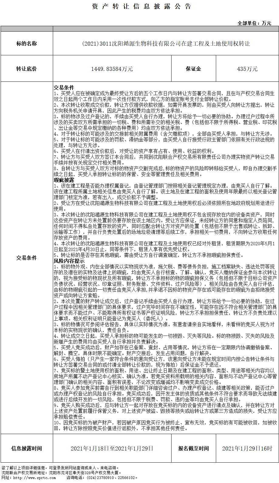 沈陽澔源生物科技有限公司在建工程及土地使用權(quán)轉(zhuǎn)讓第二次
