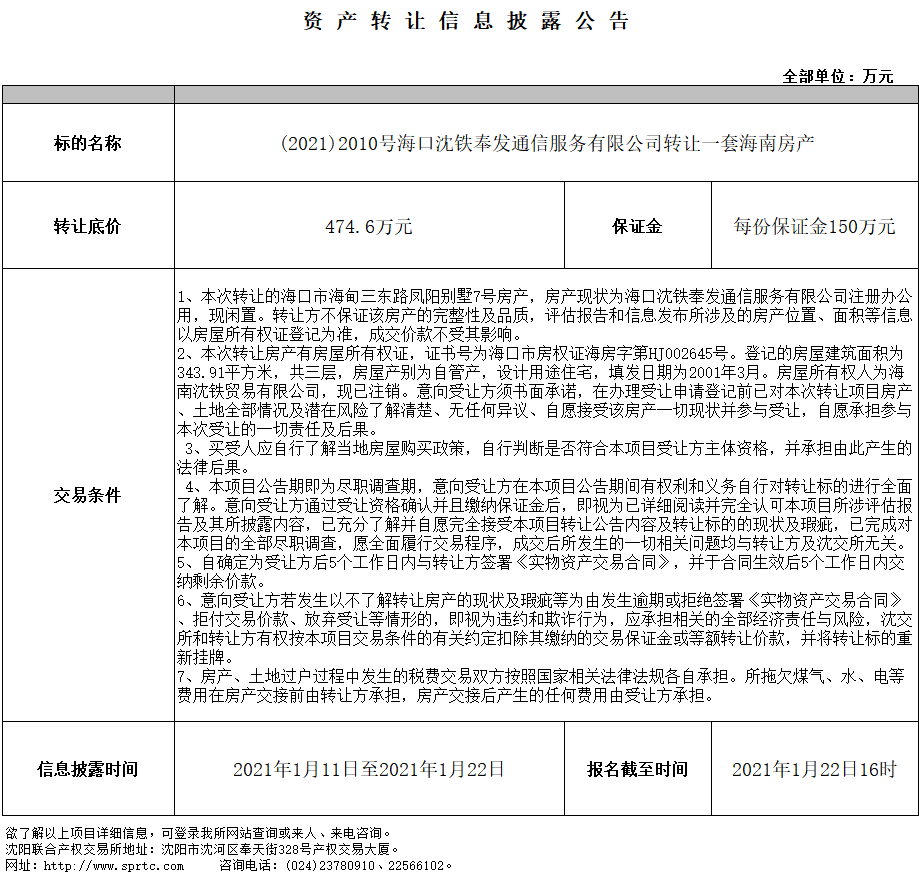 ??谏蜩F奉發(fā)通信服務(wù)有限公司轉(zhuǎn)讓一套 海南房產(chǎn)