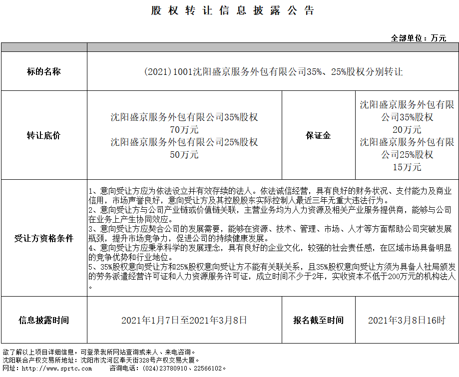 沈陽(yáng)盛京服務(wù)外包有限公司25% 股權(quán)轉(zhuǎn)讓