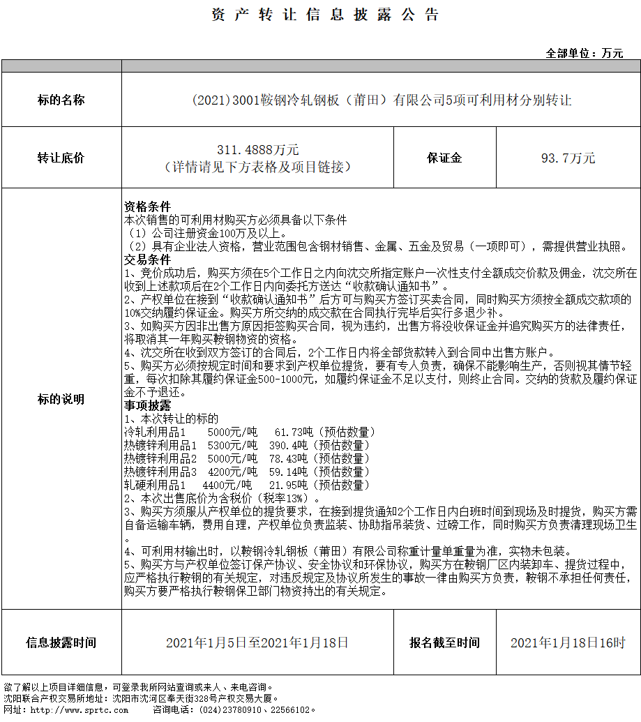 鞍鋼冷軋鋼板(莆田)有限公司冷軋利用品1轉(zhuǎn)讓