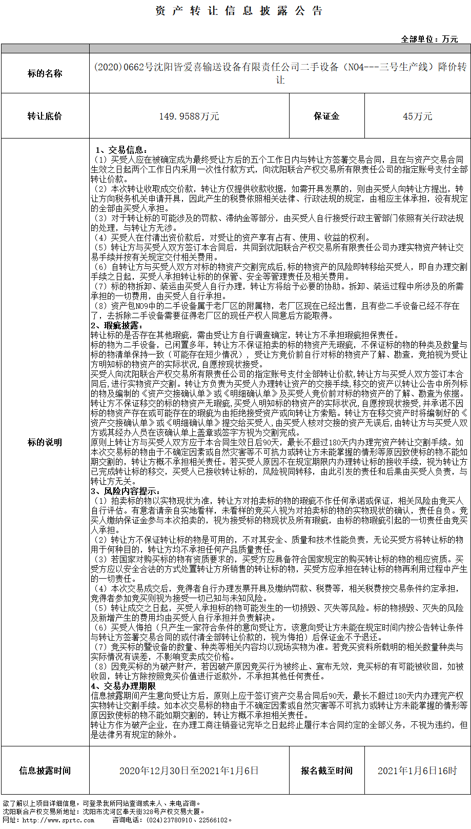 沈陽皆愛喜輸送設(shè)備有限責(zé)任公司二手設(shè)備轉(zhuǎn)讓(NO4生產(chǎn)線)