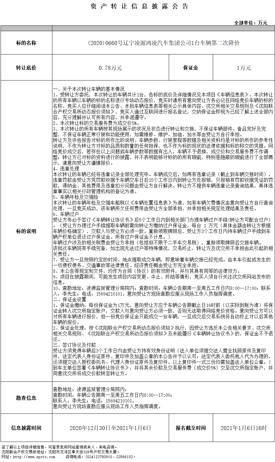 (2020)0660號遼寧凌源鴻凌汽車集團公司1臺車輛第二次降價