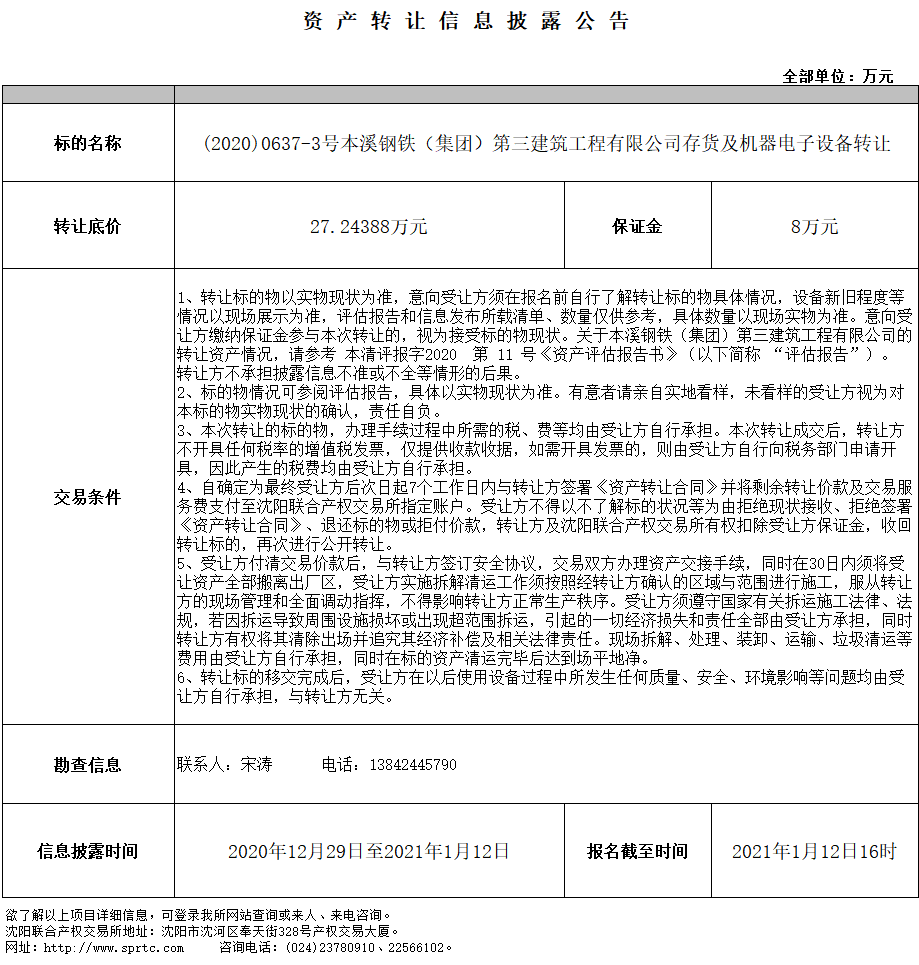 本溪鋼鐵(集團)第三建筑工程有限公司存貨、機器設備及電子設備轉(zhuǎn)讓