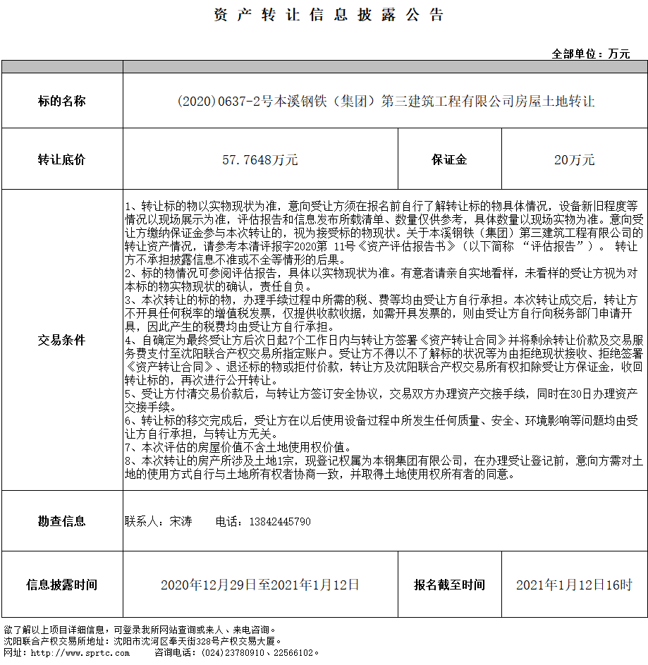本溪鋼鐵(集團(tuán))第三建筑工程有限公司房屋、土地整體轉(zhuǎn)讓