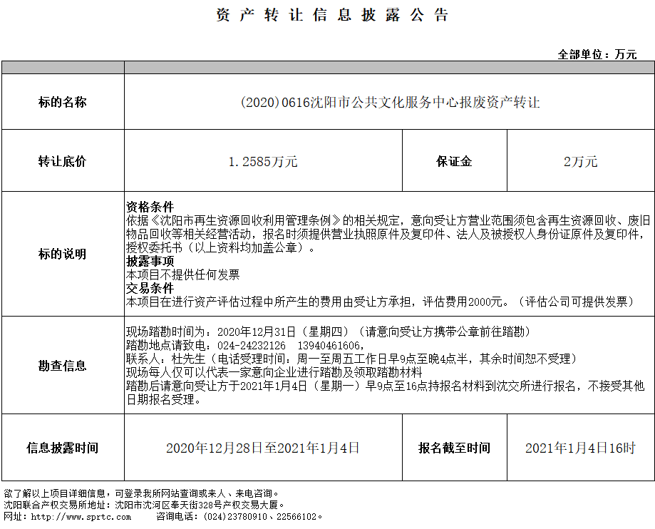 沈陽(yáng)市公共文化服務(wù)中心報(bào)廢資產(chǎn)轉(zhuǎn)讓