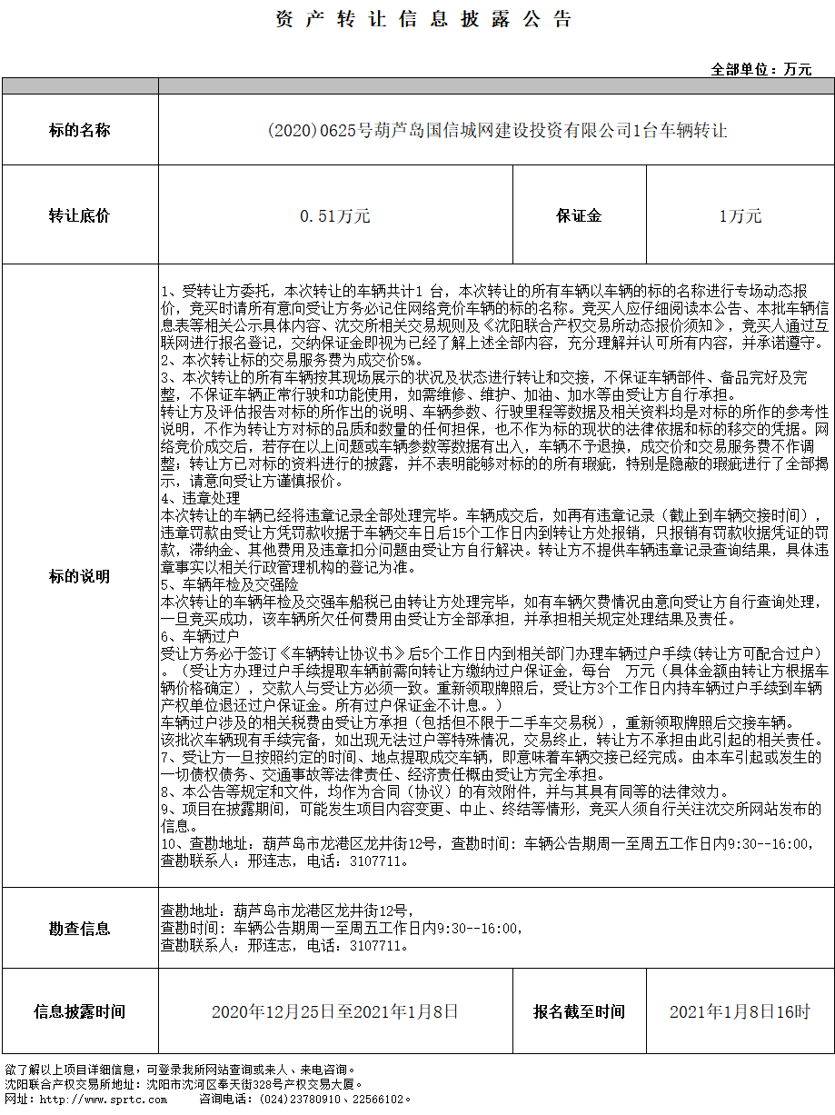葫蘆島國信城網(wǎng)建設(shè)投資有限公司1臺車輛轉(zhuǎn)讓