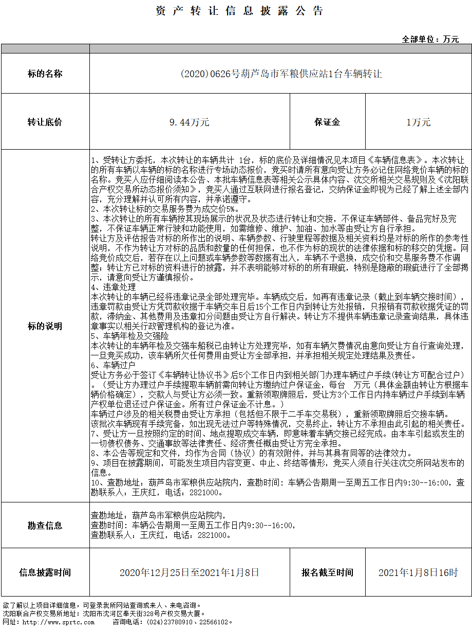 (2020)0626號葫蘆島市軍糧供應站1臺車輛轉讓