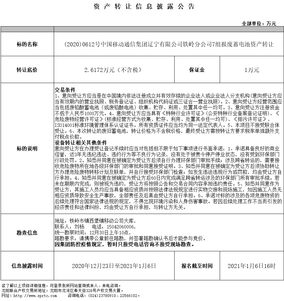 中國(guó)移動(dòng)通信集團(tuán)遼寧有限公司鐵嶺分公司7組報(bào)廢蓄電池資產(chǎn)轉(zhuǎn)讓