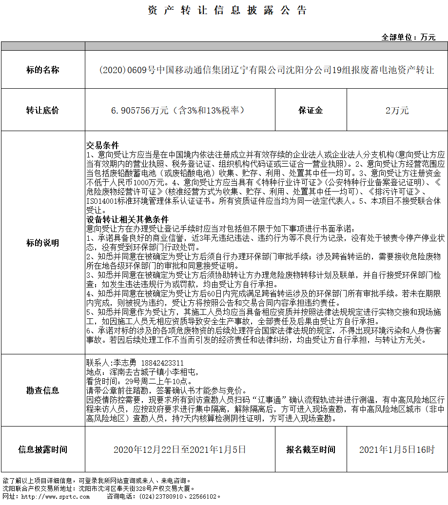 中國移動(dòng)通信集團(tuán)遼寧有限公司沈陽分公司 19組報(bào)廢蓄電池資產(chǎn)轉(zhuǎn)讓