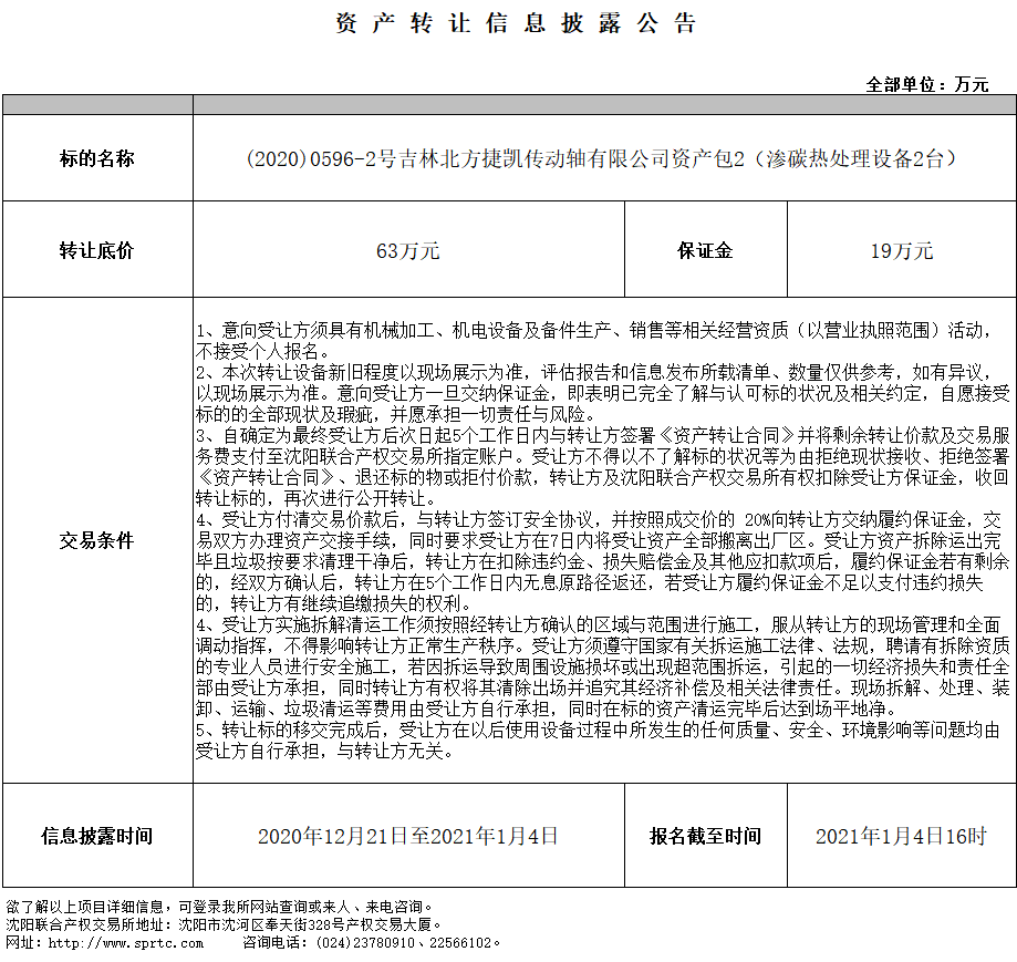 吉林北方捷凱傳動(dòng)軸有限公司資產(chǎn)包2(滲碳熱處理設(shè)備2臺(tái))