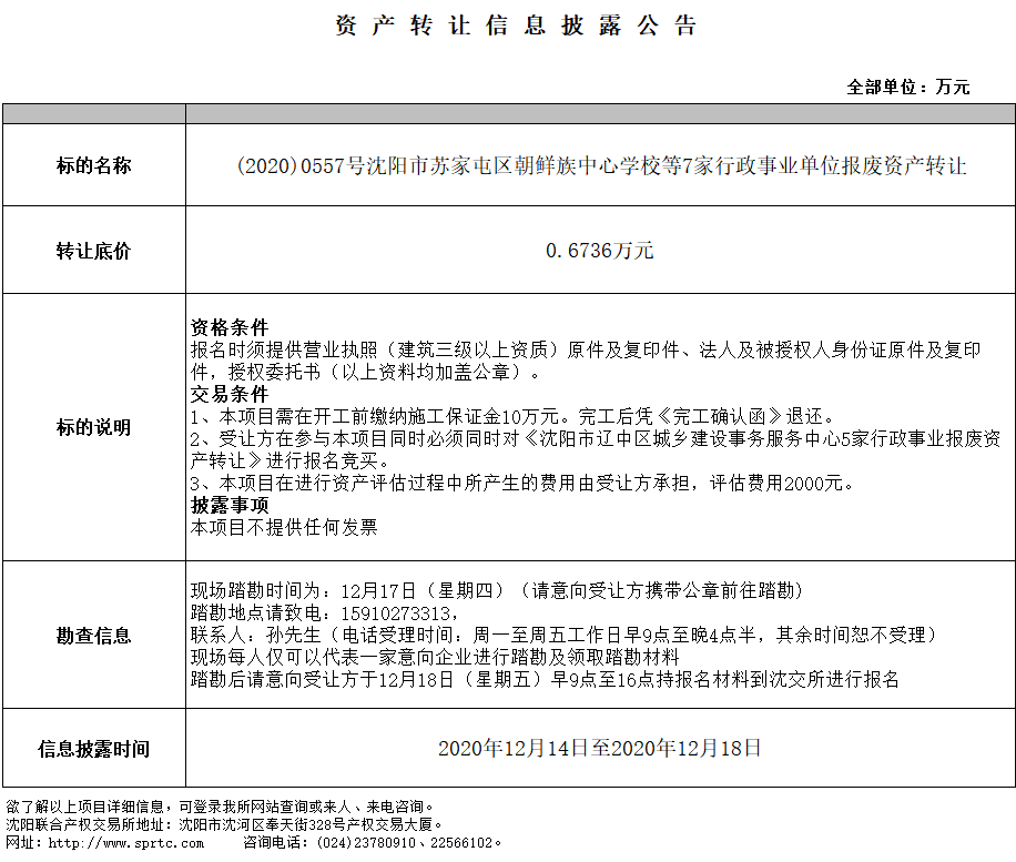 沈陽(yáng)市蘇家屯區(qū)朝鮮族中心學(xué)校等7家報(bào)廢資產(chǎn)轉(zhuǎn)讓(含拆除)