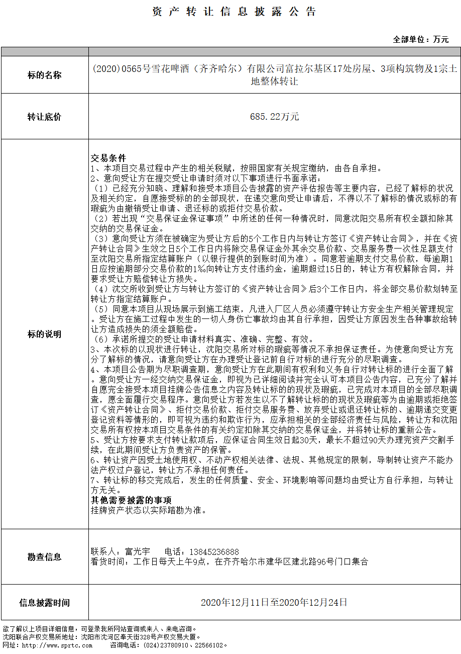 雪花啤酒(齊齊哈爾)有限公司富拉爾基區(qū)17處房屋、3項構(gòu)筑物及1宗土地整體轉(zhuǎn)讓
