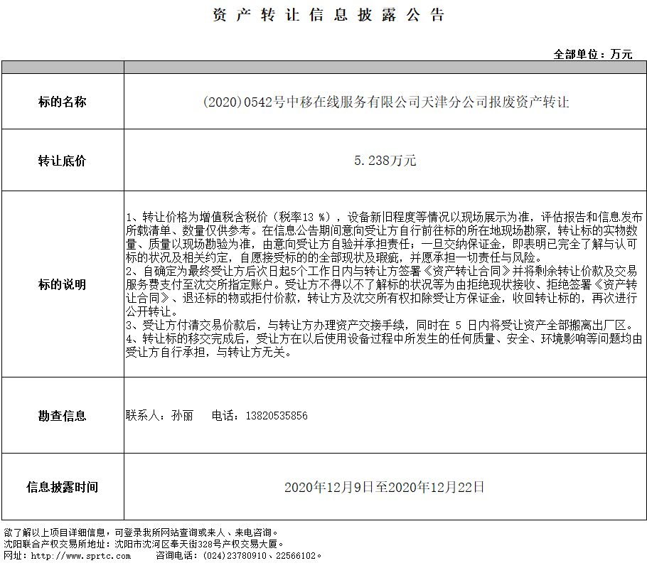 中移在線服務有限公司天津分公司報廢資產(chǎn)轉(zhuǎn)讓