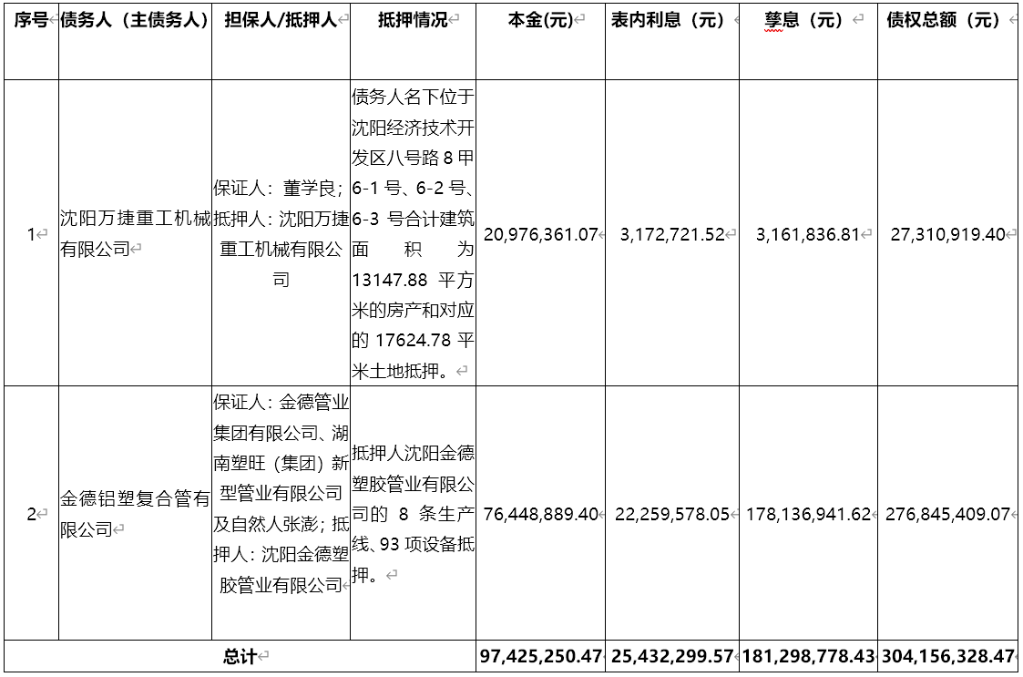 2、標的基本信息:截至2020年10月20日,沈陽萬捷重工機械有限公司等2戶不良債權(quán)尚欠本金共97,425,250.47元,表內(nèi)利息共25,432,299.57元,孳息共181,298,778.43元,債權(quán)總計304,156,328.47元。債務人實際應支付的利息、罰息數(shù)額應計算至其全部債務清償完畢之日止,不以交易基準日利息為限?;厩闆r如下: