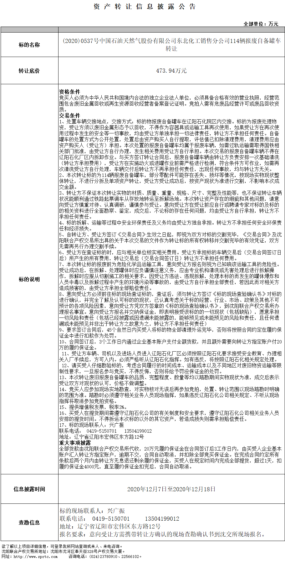 中國石油東北化工銷售分公司114輛報(bào)廢自備罐車轉(zhuǎn)讓