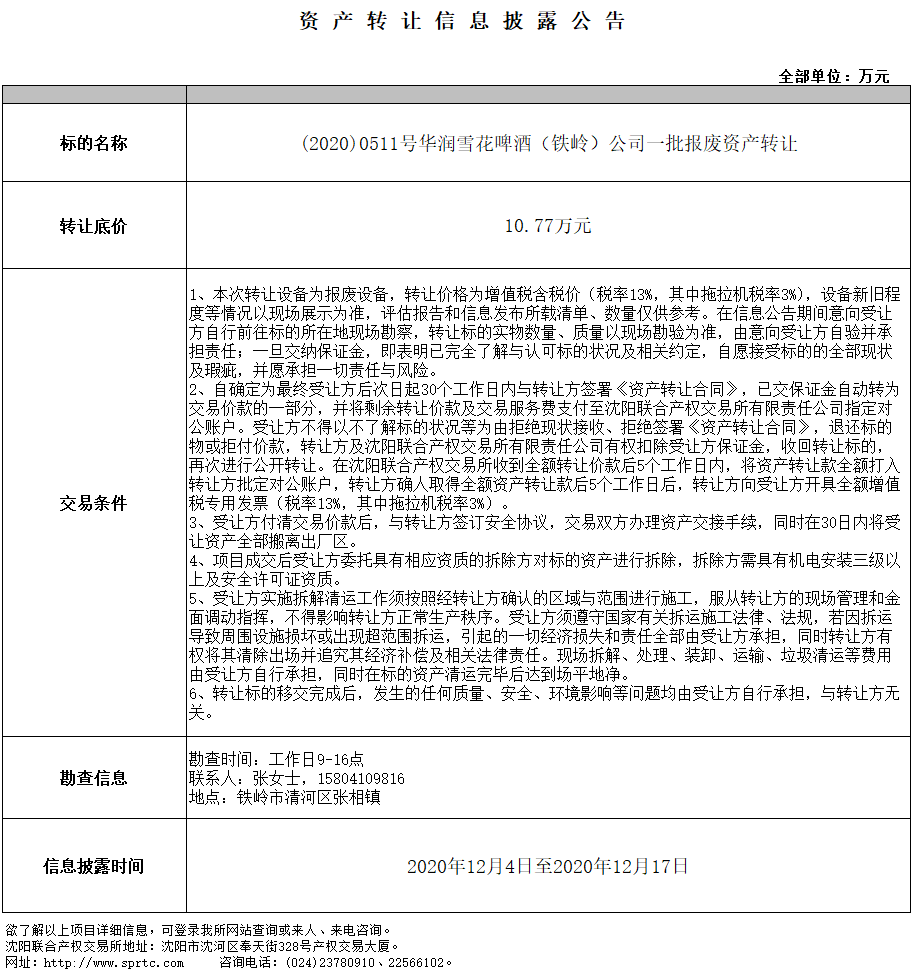 華潤(rùn)雪花啤酒(鐵嶺)有限公司一批報(bào)廢資產(chǎn)轉(zhuǎn)讓